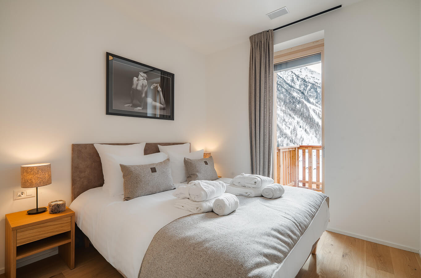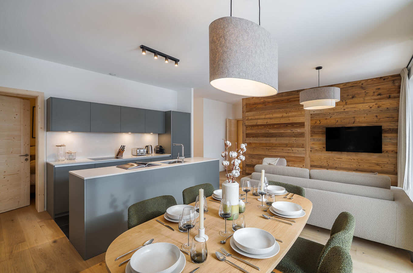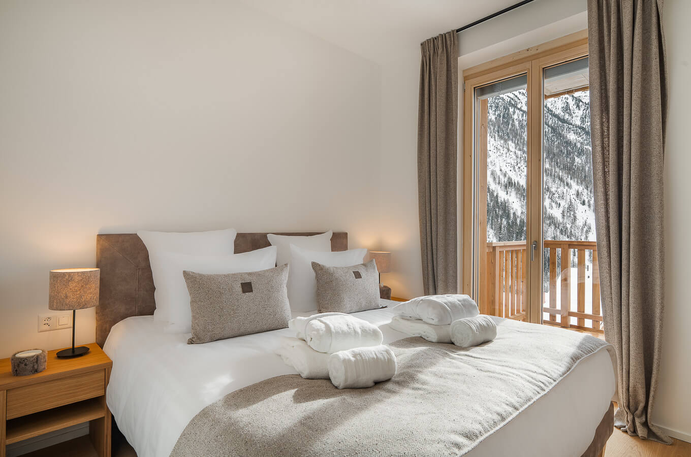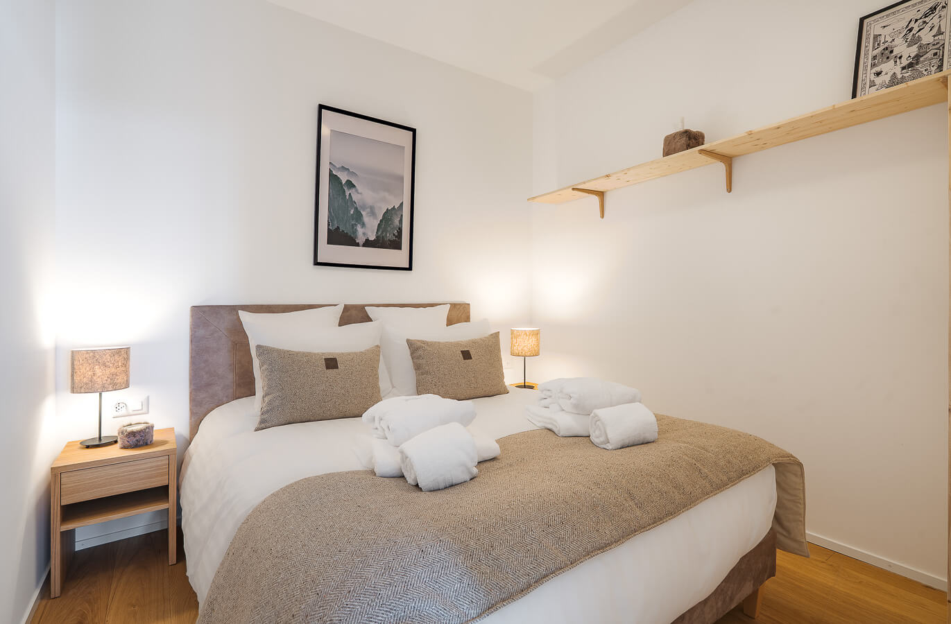 Diese Wohnung verfügt über zwei Schlafzimmer mit Doppelbetten (180 × 200 cm, 160 × 200 cm), ein fensterloses Schlafzimmer mit Doppelbett (160 × 200 cm) sowie über zwei Badezimmer, eines davon mit Badewanne. Der Wohnbereich bietet eine Sitzecke mit Fernseher und eine voll ausgestattete offene Küche. Möblierte Balkone ergänzen den Wohnraum. Zur Ausstattung der Wohnung gehören Haushaltsgeräte wie Waschmaschine, Geschirrspüler, Nespresso-Kaffeemaschine, notwendige Küchenutensilien usw.