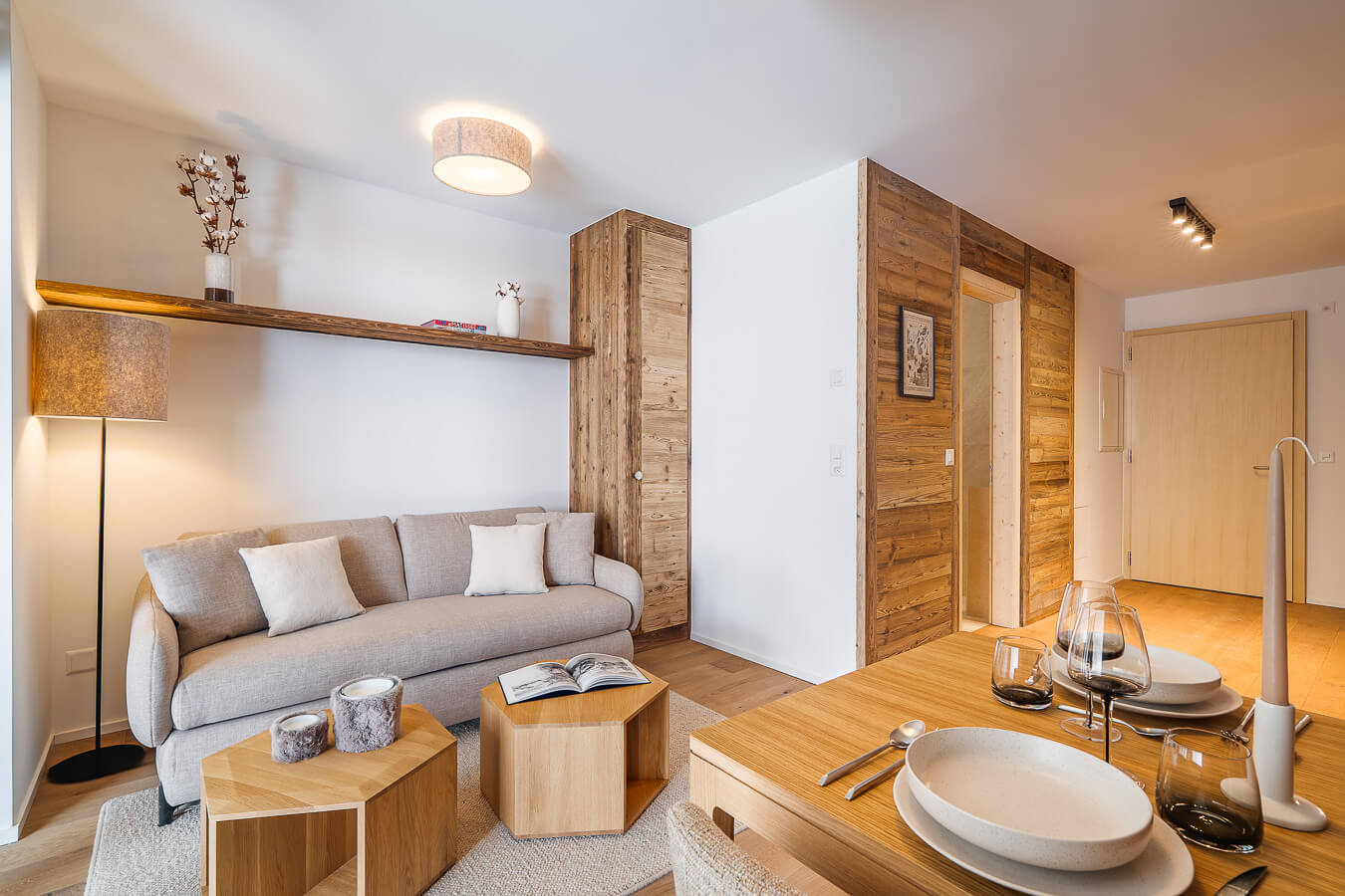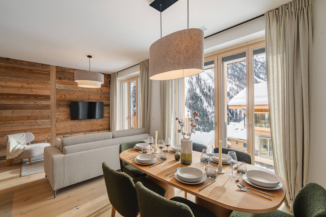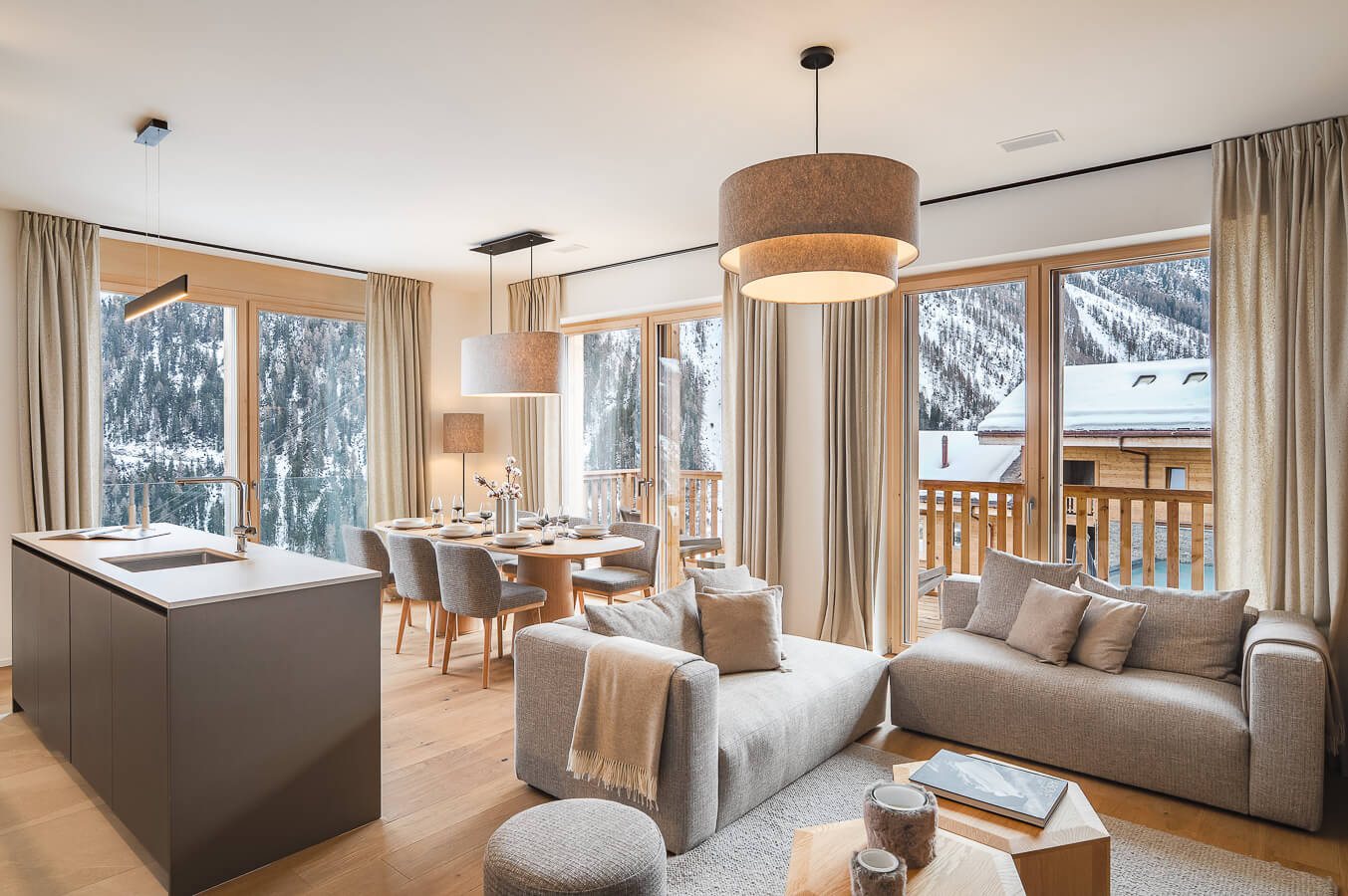 Diese Wohnung verfügt über zwei Schlafzimmer mit Doppelbetten (180 × 200 cm, 160 × 200 cm), ein fensterloses Schlafzimmer mit Doppelbett (160 × 200 cm) sowie über zwei Badezimmer, eines davon mit Badewanne. Der Wohnbereich bietet eine Sitzecke mit Fernseher und eine voll ausgestattete offene Küche. Möblierte Balkone ergänzen den Wohnraum. Zur Ausstattung der Wohnung gehören Haushaltsgeräte wie Waschmaschine, Geschirrspüler, Nespresso-Kaffeemaschine, notwendige Küchenutensilien usw.