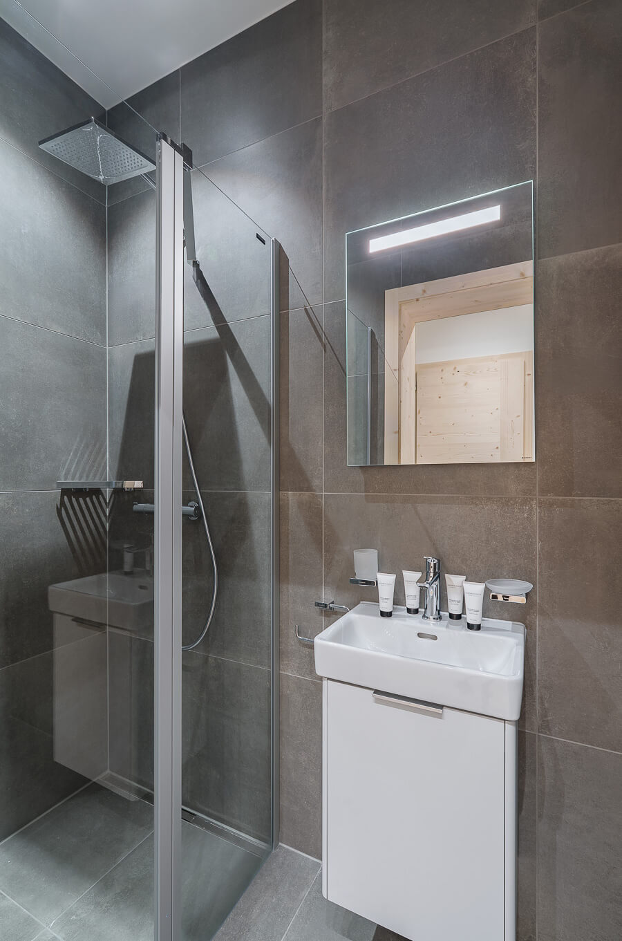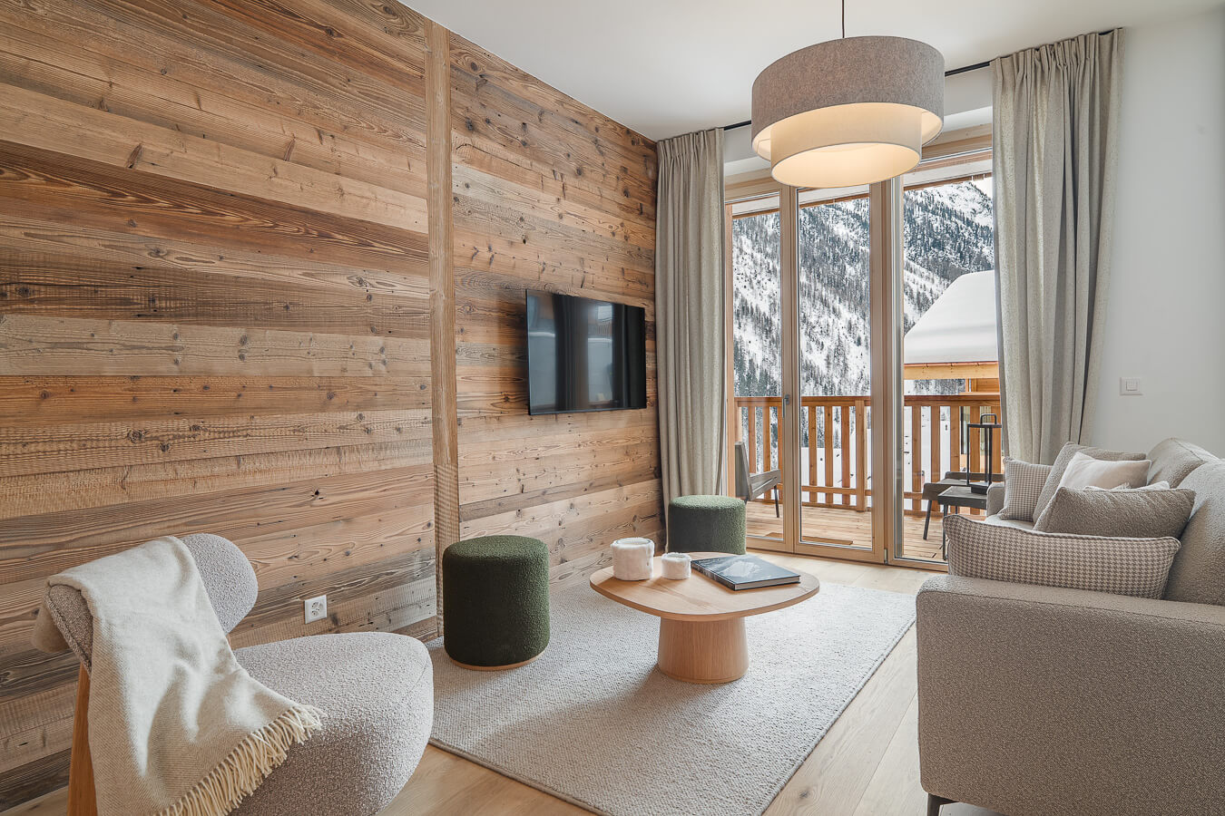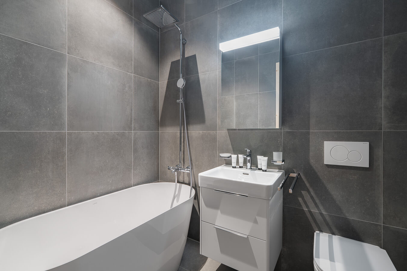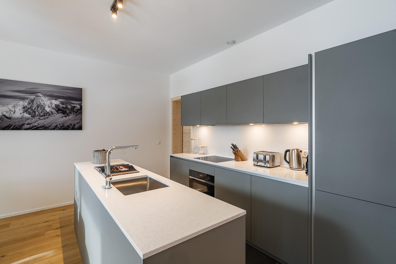 Diese Wohnung verfügt über zwei Schlafzimmer mit Doppelbetten (180 × 200 cm, 160 × 200 cm), ein fensterloses Schlafzimmer mit Doppelbett (160 × 200 cm) sowie über zwei Badezimmer, eines davon mit Badewanne. Der Wohnbereich bietet eine Sitzecke mit Fernseher und eine voll ausgestattete offene Küche. Möblierte Balkone ergänzen den Wohnraum. Zur Ausstattung der Wohnung gehören Haushaltsgeräte wie Waschmaschine, Geschirrspüler, Nespresso-Kaffeemaschine, notwendige Küchenutensilien usw.