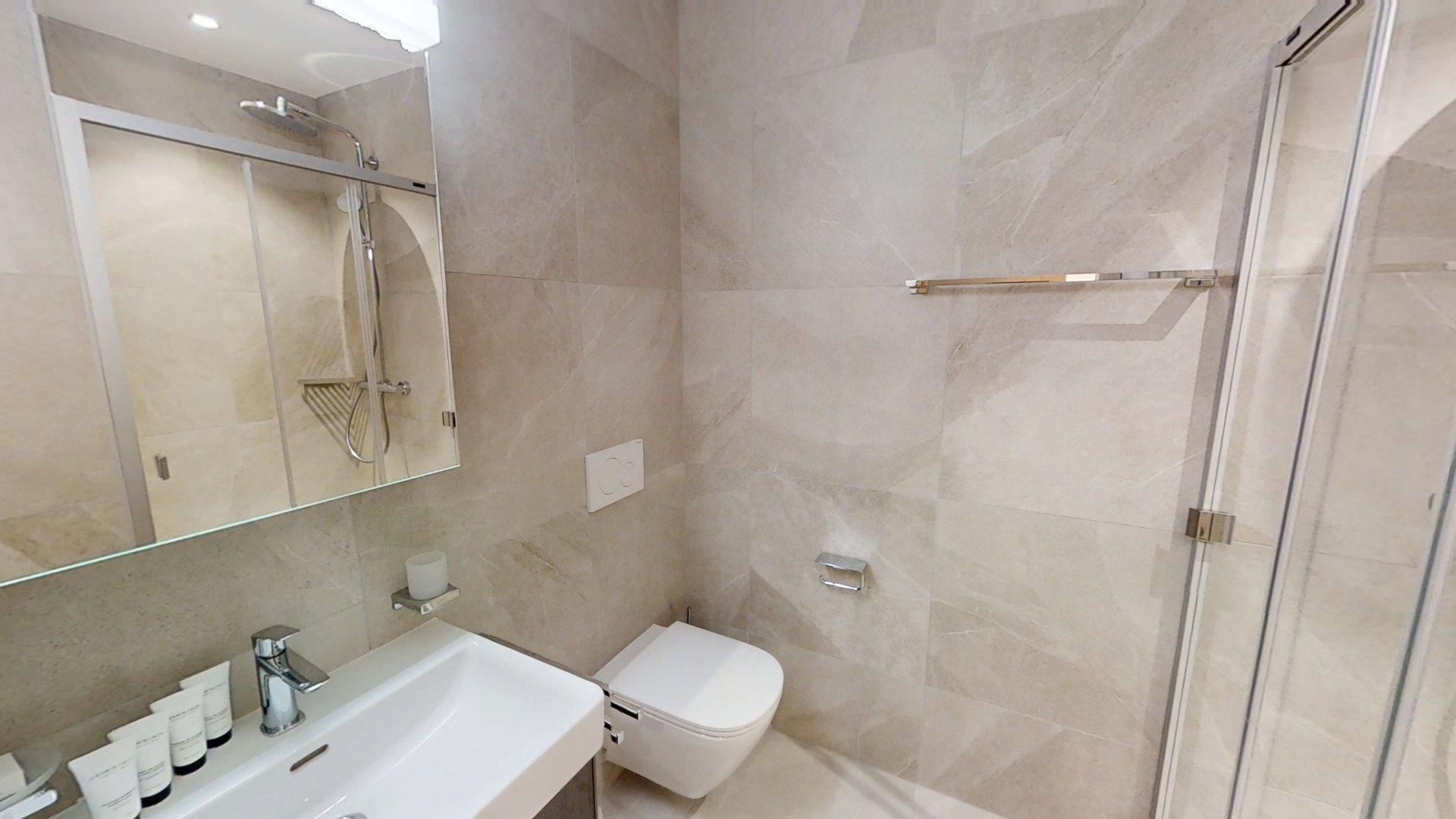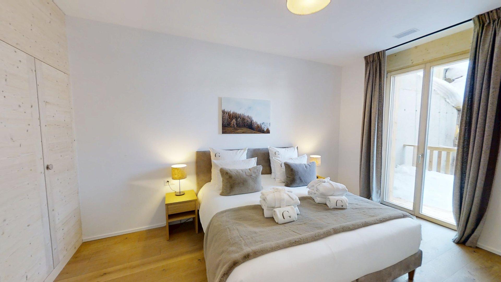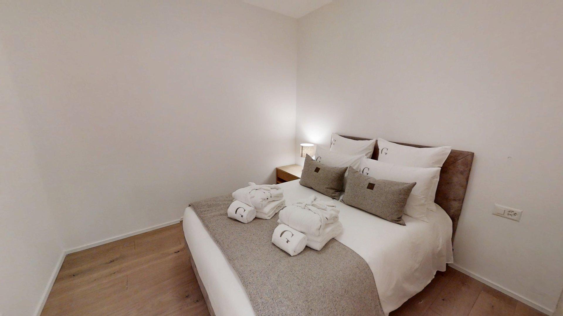 Diese Wohnung verfügt über ein Schlafzimmer mit Doppelbett (180 × 200 cm), ein fensterloses Schlafzimmer mit Doppelbett (140 × 200 cm) sowie über ein Badezimmer. Der Wohnbereich bietet eine Sitzecke mit Fernseher und eine voll ausgestattete offene Küche. Ein möblierter Balkon ergänzt den Wohnraum. Zur Ausstattung der Wohnung gehören Haushaltsgeräte wie Geschirrspüler, Nespresso-Kaffeemaschine, notwendige Küchenutensilien usw.