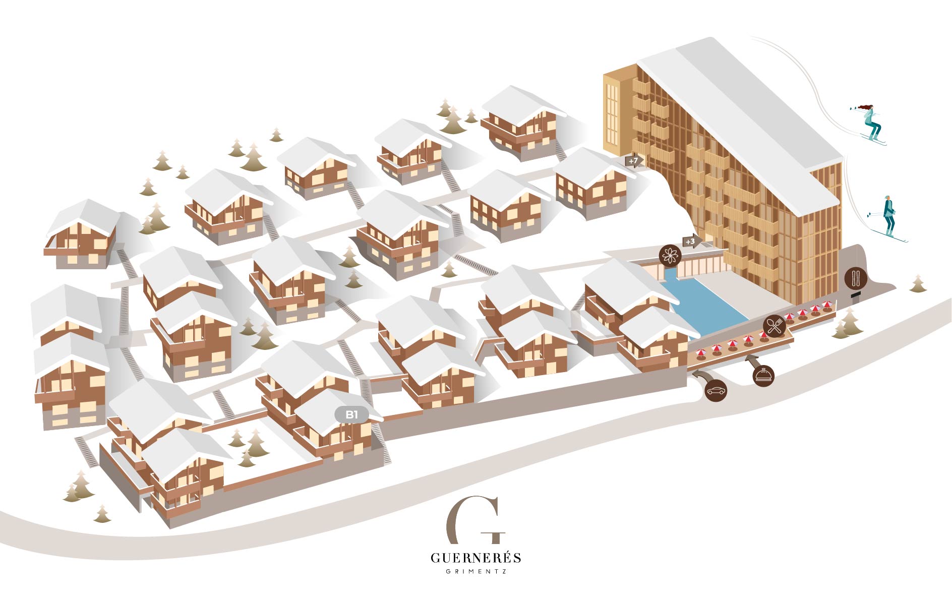Das freistehende Chalet B1, gelegen an der linken Südseite in der unteren Reihe des Chalet-Bereichs des Resorts Guernerés, erstreckt sich über 3 Ebenen und bietet eine Fläche von 179 m² sowie Platz für bis zu 8 Personen, maximal 6 Erwachsene.