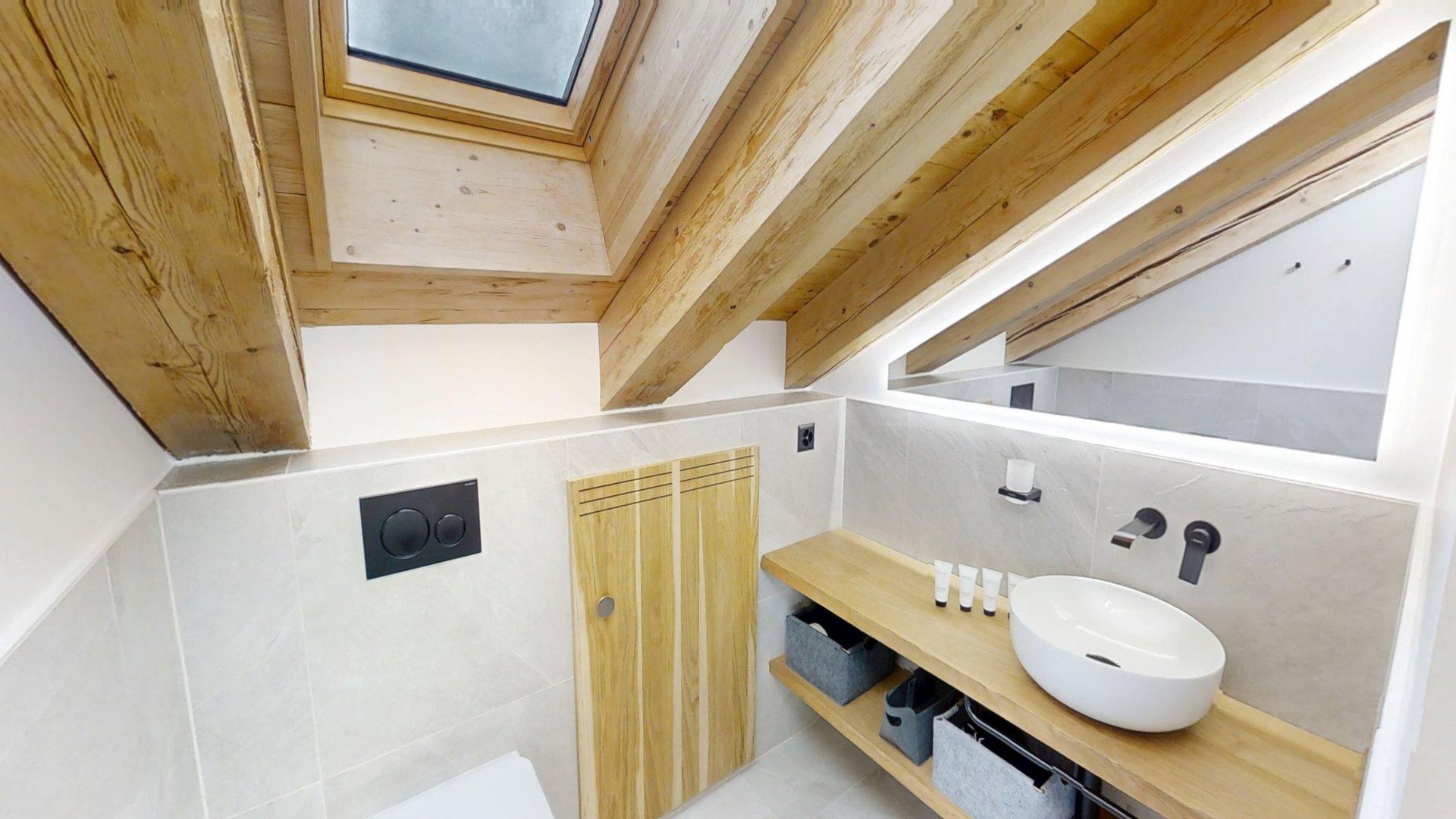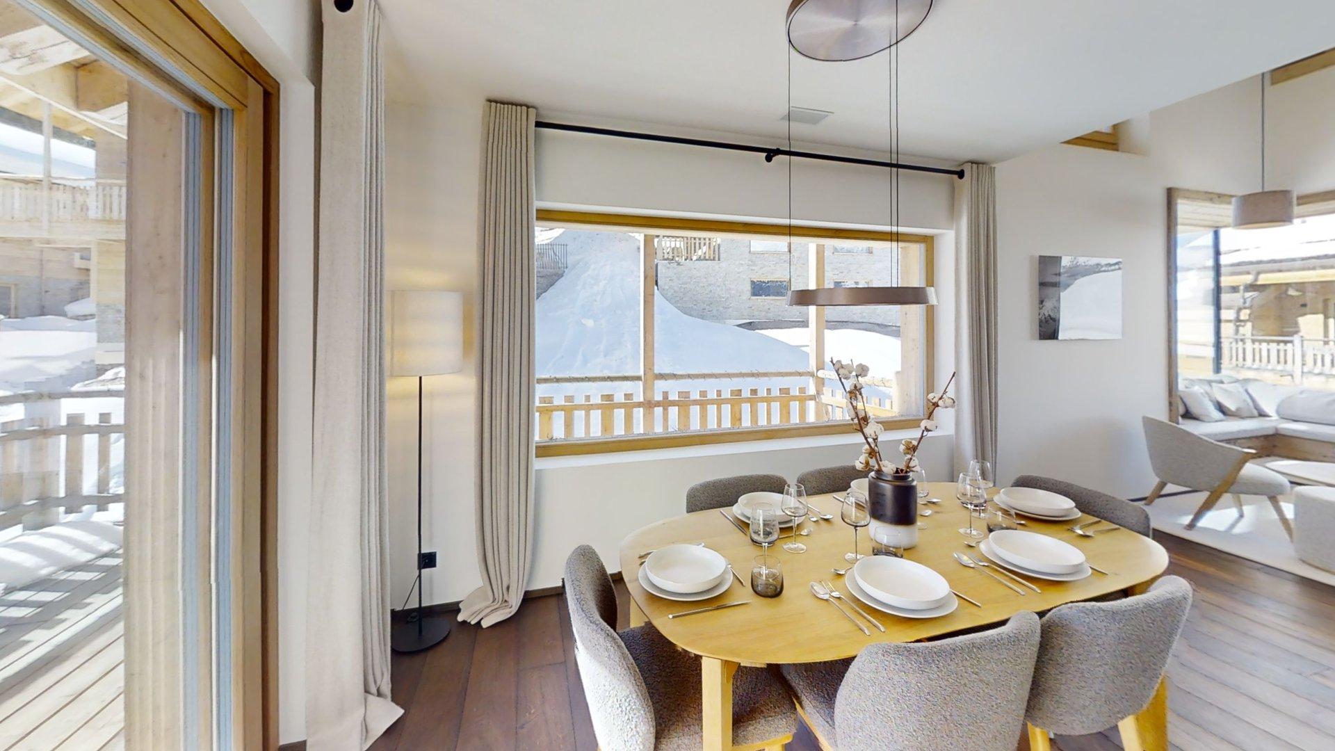 Diese Chalet-Wohnung verfügt über drei Schlafzimmer mit Doppelbett (180 × 200 cm) sowie über drei Badezimmer mit Dusche. Der Wohnbereich bietet eine Sitzecke, eine voll ausgestattete Küche, einen Holzofen und einen nach Südwesten ausgerichteten Balkon. Das Chalet ist nach allen Himmelsrichtungen ausgerichtet, sodass Licht und Aussicht sich im Laufe des Tages ständig ändern. Zur Ausstattung gehören Haushaltsgeräte wie Geschirrspüler, Nespresso-Kaffeemaschine, notwendige Küchenutensilien usw.