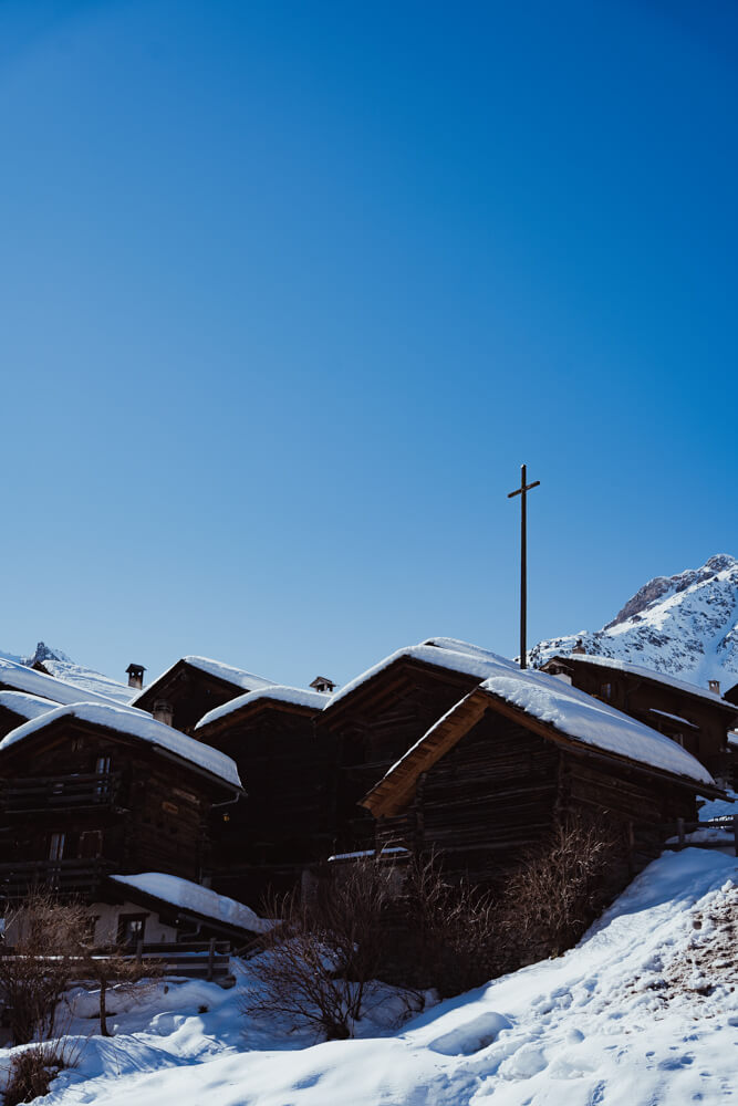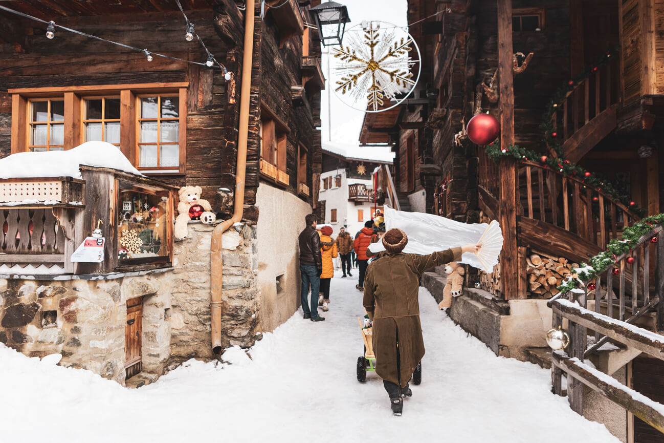 Im Herzen des Val d'Anniviers offenbart Grimentz im Winter den ganzen Reichtum seines alpinen Kulturerbes. Die zwischen Himmel und Bergen gelegenen Scheunen, Heuböden und Maiensässe erzählen vom rustikalen Leben vergangener Zeiten, das von den Jahreszeiten, der Landwirtschaft und dem Wissen der Vorfahren geprägt war. Jedes Gebäude aus Lärchenholz, jeder sonnengetrocknete Stein zeugt von einem Einfallsreichtum, der sich an der Natur orientiert. Im Winter finden in den belebten Gassen lokale Feste, Handwerksausstellungen und Besichtigungen von Kulturerbestätten statt, wodurch die lebendigen Traditionen des Tals fortgeführt werden. In Grimentz treffen Vergangenheit und Gegenwart in einer geschützten Berglandschaft aufeinander und bieten ein sinnliches und unverfälschtes Erlebnis.