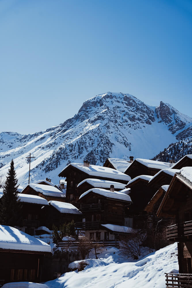 Das auf 1564 Metern Höhe gelegene Grimentz ist ein Winterschmuck im Val d'Anniviers. Dieses idyllische Dorf besticht durch seine mit Geranien geschmückten Gassen, die jeden Balkon zieren, seine von der Zeit gezeichneten Lärchenchalets und seinen atemberaubenden Blick auf die Alpengipfel. Grimentz ist der ideale Ausgangspunkt für Wanderungen, Outdoor-Aktivitäten und die Erkundung eines gut erhaltenen Kulturerbes und verkörpert den Winter in den Bergen in seiner ganzen Pracht.