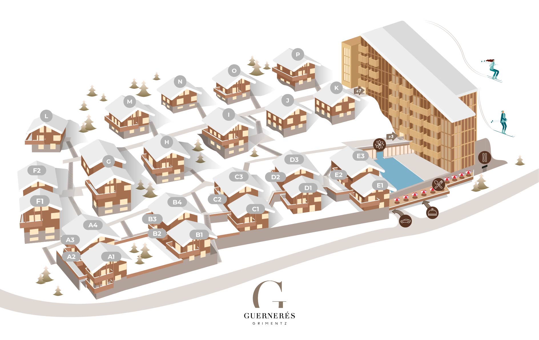 Die 5-Sterne- Ferienanlage Guernerés umfasst zwei sich ergänzende Bereiche: Die Chalets, echte intime Rückzugsorte, und die Residenz, das pulsierende Herzstück der Anlage, in dem sich alle gehobenen Hoteldienstleistungen konzentrieren. Wenn Sie sich für eines der Chalets entscheiden, profitieren Sie von einem privilegierten Zugang zu allen Gemeinschaftsbereichen in der Nähe: 700 m² großer Wellnessbereich mit Innen- und Außenpool, Spa, Fitnessraum mit Aussicht, Restaurant, Lounge-Bar, Kinderbereich und Rezeption mit maßgeschneidertem Concierge-Service. Eine perfekte Balance zwischen Unabhängigkeit und exklusiven Leistungen für einen außergewöhnlichen Winterurlaub in den Bergen.