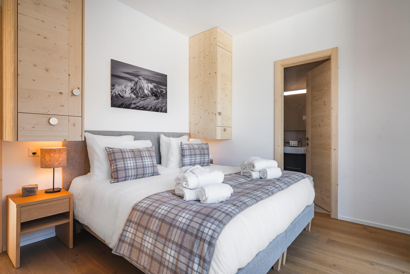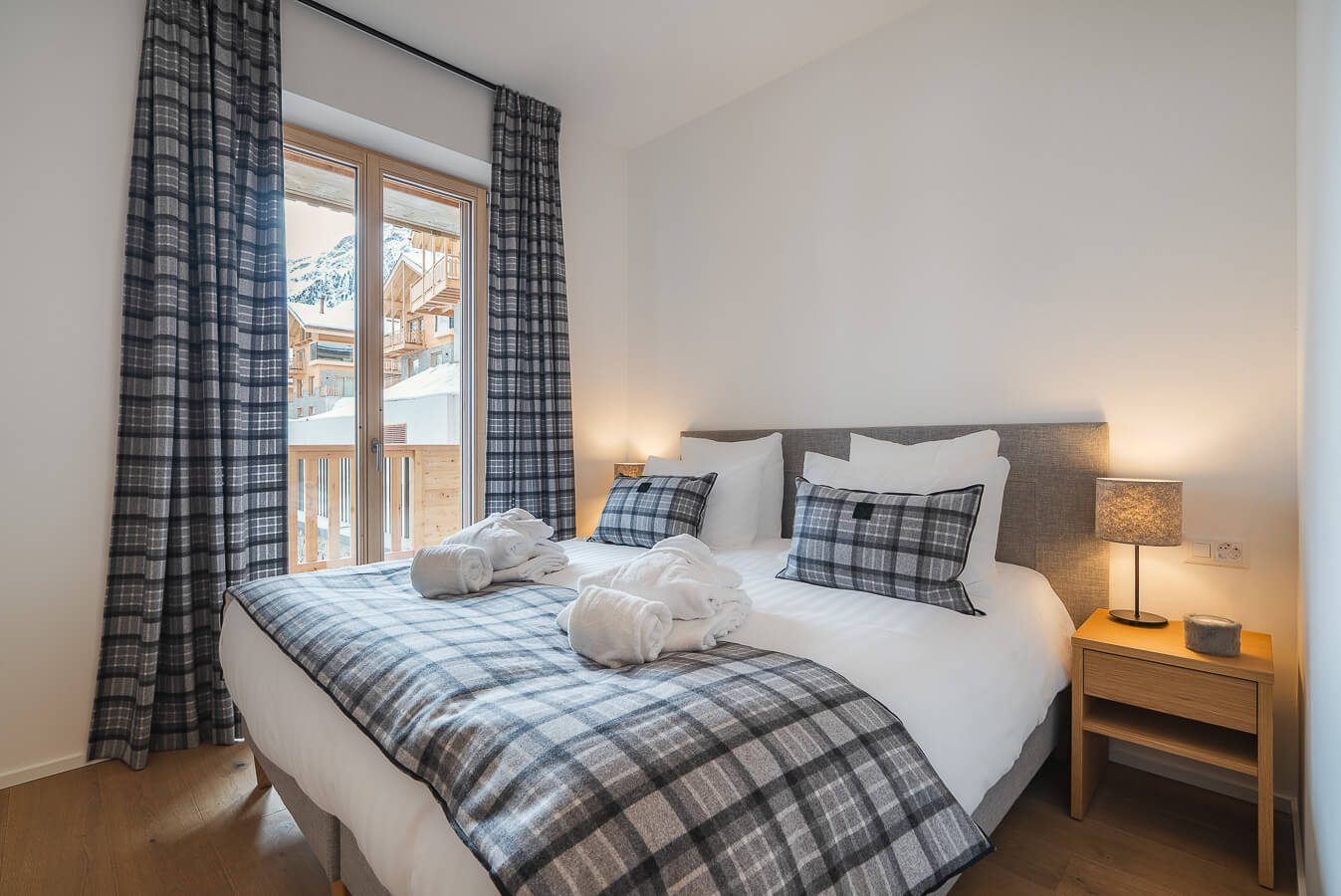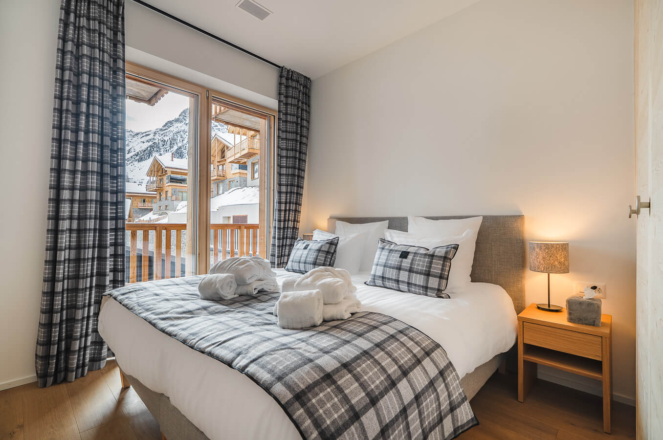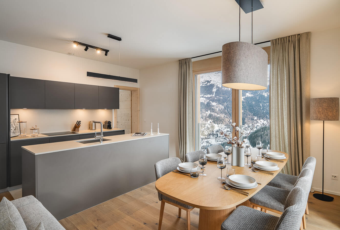 Diese Wohnung verfügt über drei Schlafzimmer mit einem Doppelbett (180 × 200 cm), ein Kabinenschlafzimmer mit Etagenbett sowie über drei Badezimmer. Der Wohnbereich bietet eine Sitzecke mit Fernseher und eine voll ausgestattete offene Küche. Zwei Balkone ergänzen den Wohnraum. Zur Ausstattung der Wohnung gehören Haushaltsgeräte wie eine Waschmaschine, ein Geschirrspüler, eine Nespresso-Kaffeemaschine, die notwendigen Küchenutensilien usw.