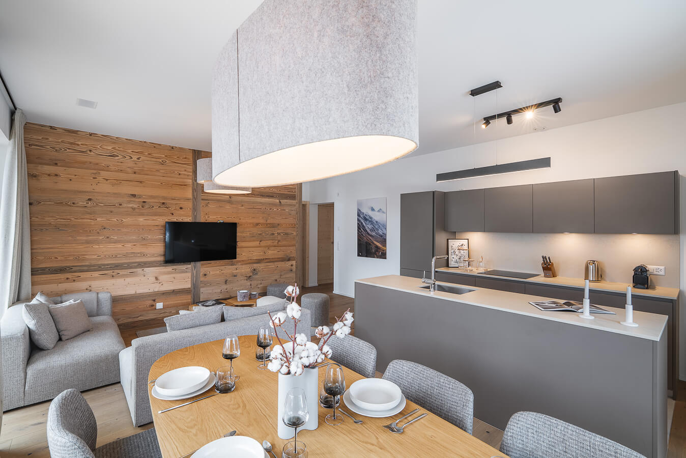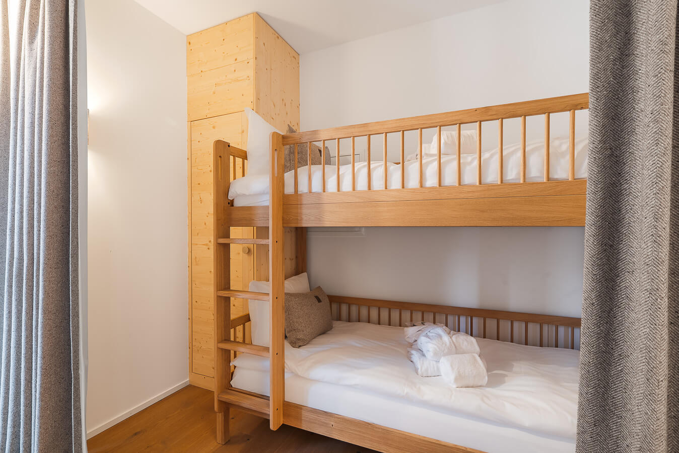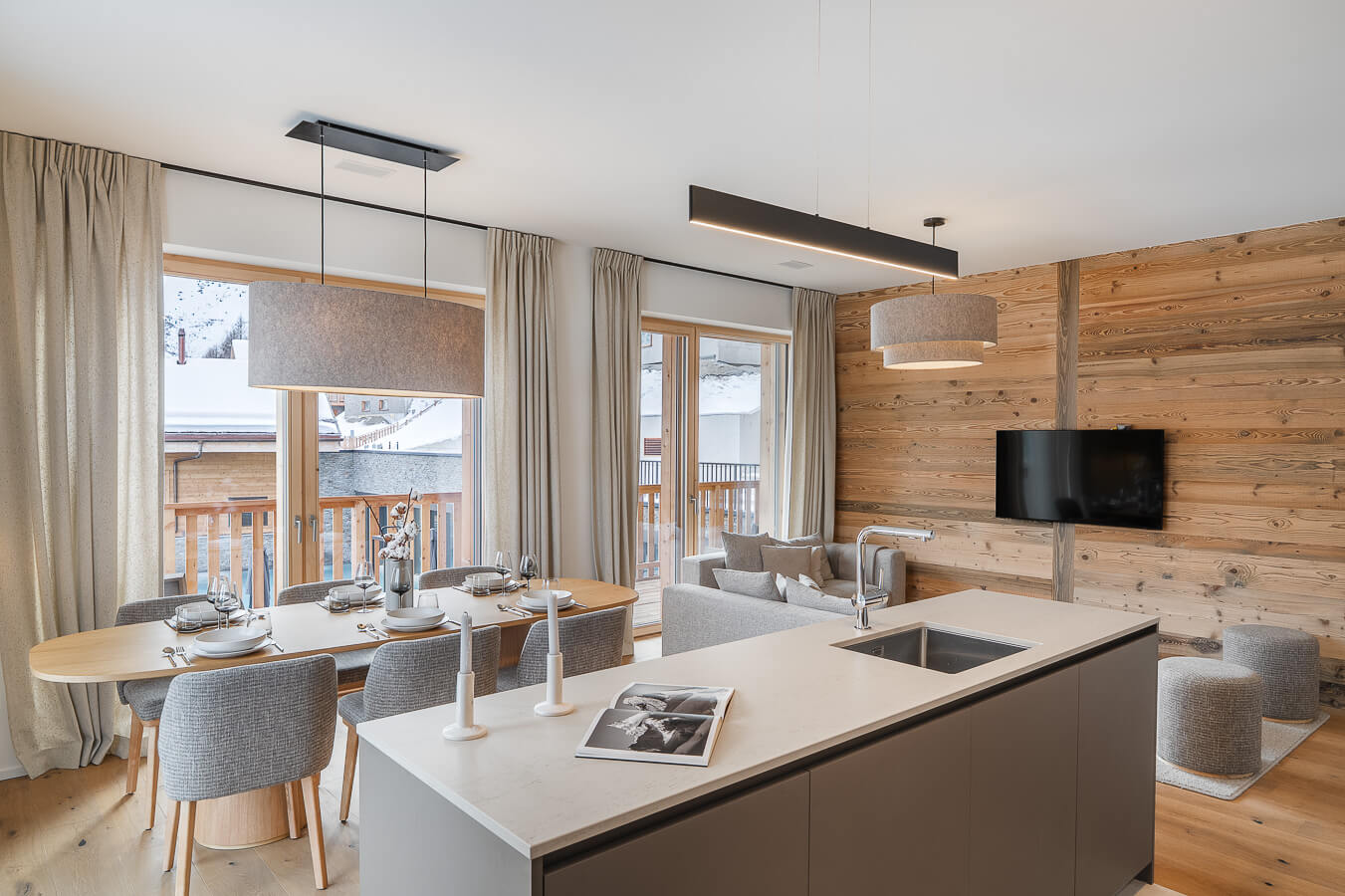Diese Wohnung verfügt über drei Schlafzimmer mit einem Doppelbett (180 × 200 cm), ein Kabinenschlafzimmer mit Etagenbett sowie über drei Badezimmer. Der Wohnbereich bietet eine Sitzecke mit Fernseher und eine voll ausgestattete offene Küche. Zwei Balkone ergänzen den Wohnraum. Zur Ausstattung der Wohnung gehören Haushaltsgeräte wie eine Waschmaschine, ein Geschirrspüler, eine Nespresso-Kaffeemaschine, die notwendigen Küchenutensilien usw.