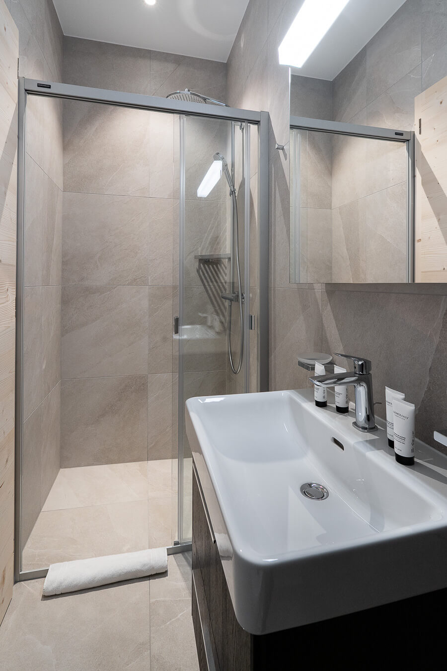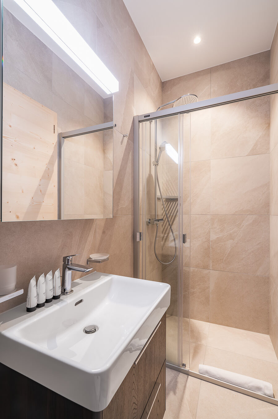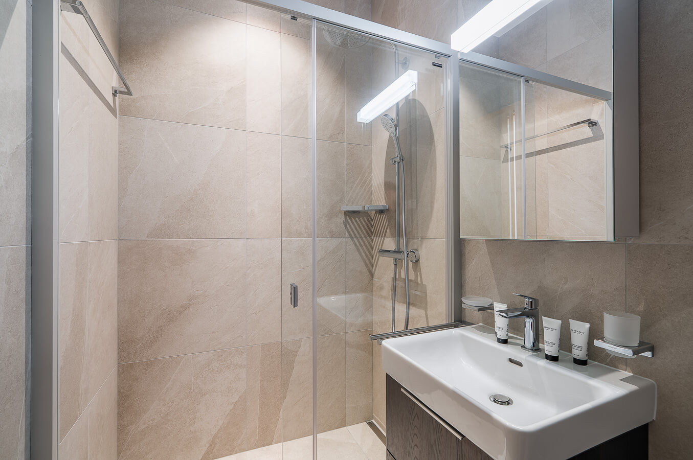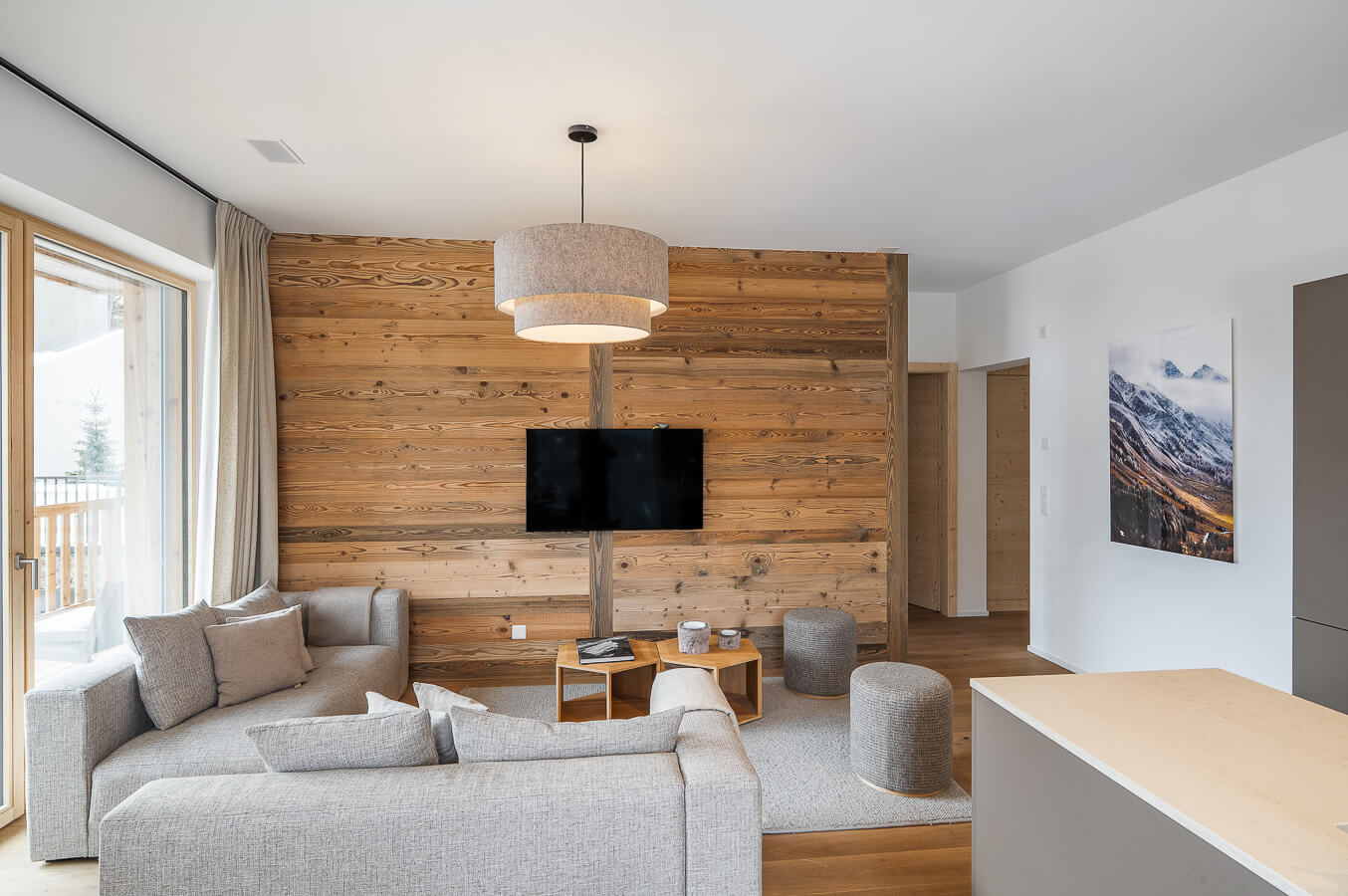 Diese Wohnung verfügt über drei Schlafzimmer mit einem Doppelbett (180 × 200 cm), ein Kabinenschlafzimmer mit Etagenbett sowie über drei Badezimmer. Der Wohnbereich bietet eine Sitzecke mit Fernseher und eine voll ausgestattete offene Küche. Zwei Balkone ergänzen den Wohnraum. Zur Ausstattung der Wohnung gehören Haushaltsgeräte wie eine Waschmaschine, ein Geschirrspüler, eine Nespresso-Kaffeemaschine, die notwendigen Küchenutensilien usw.