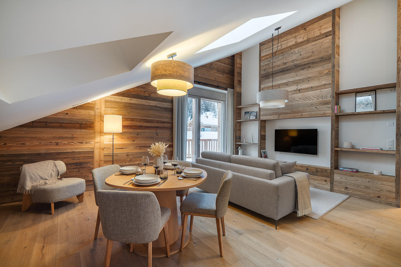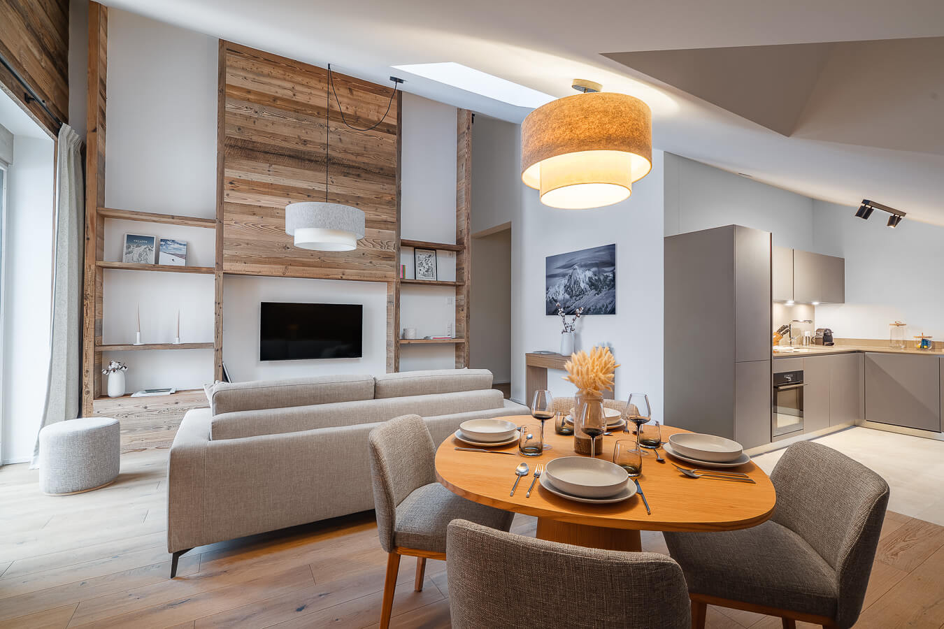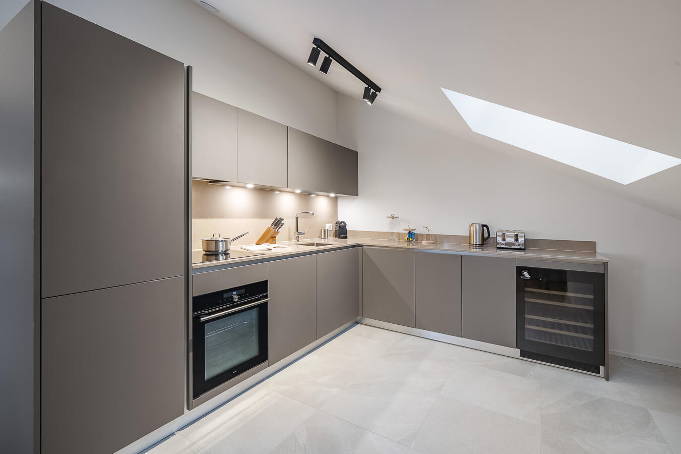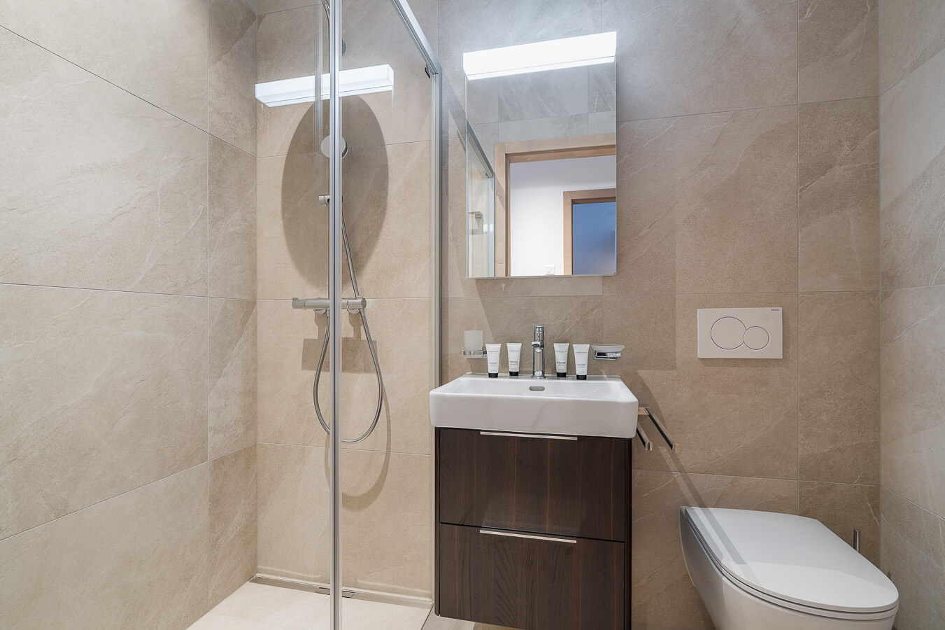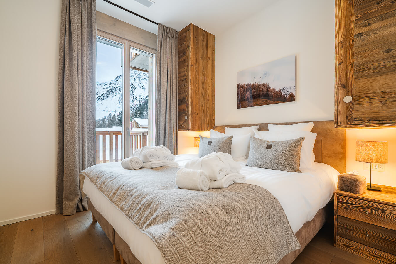 Diese Wohnung verfügt über zwei Schlafzimmer mit Doppelbett (180 × 200 cm) sowie über zwei Badezimmer en suite. Der Wohnbereich bietet eine Sitzecke mit Fernseher und eine voll ausgestattete offene Küche. Balkone ergänzen den Wohnraum. Zur Ausstattung der Wohnung gehören Haushaltsgeräte wie Geschirrspüler, Nespresso-Kaffeemaschine, notwendige Küchenutensilien usw.