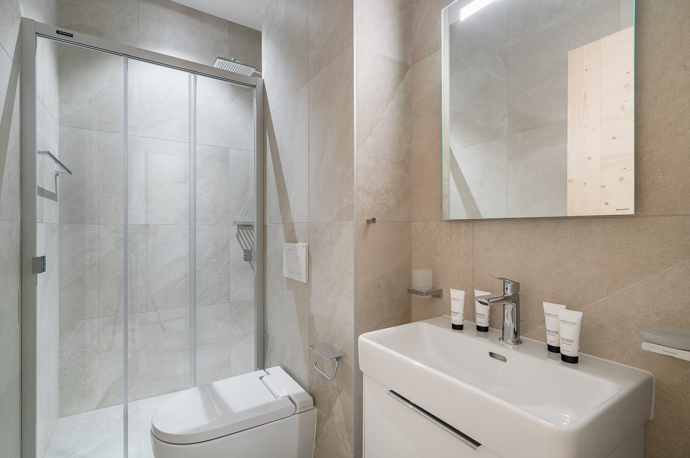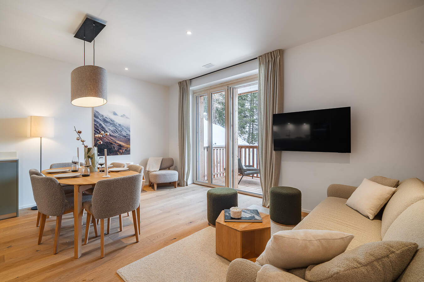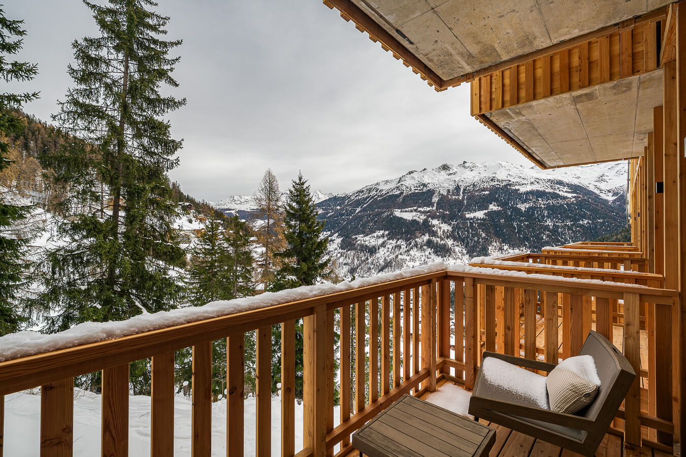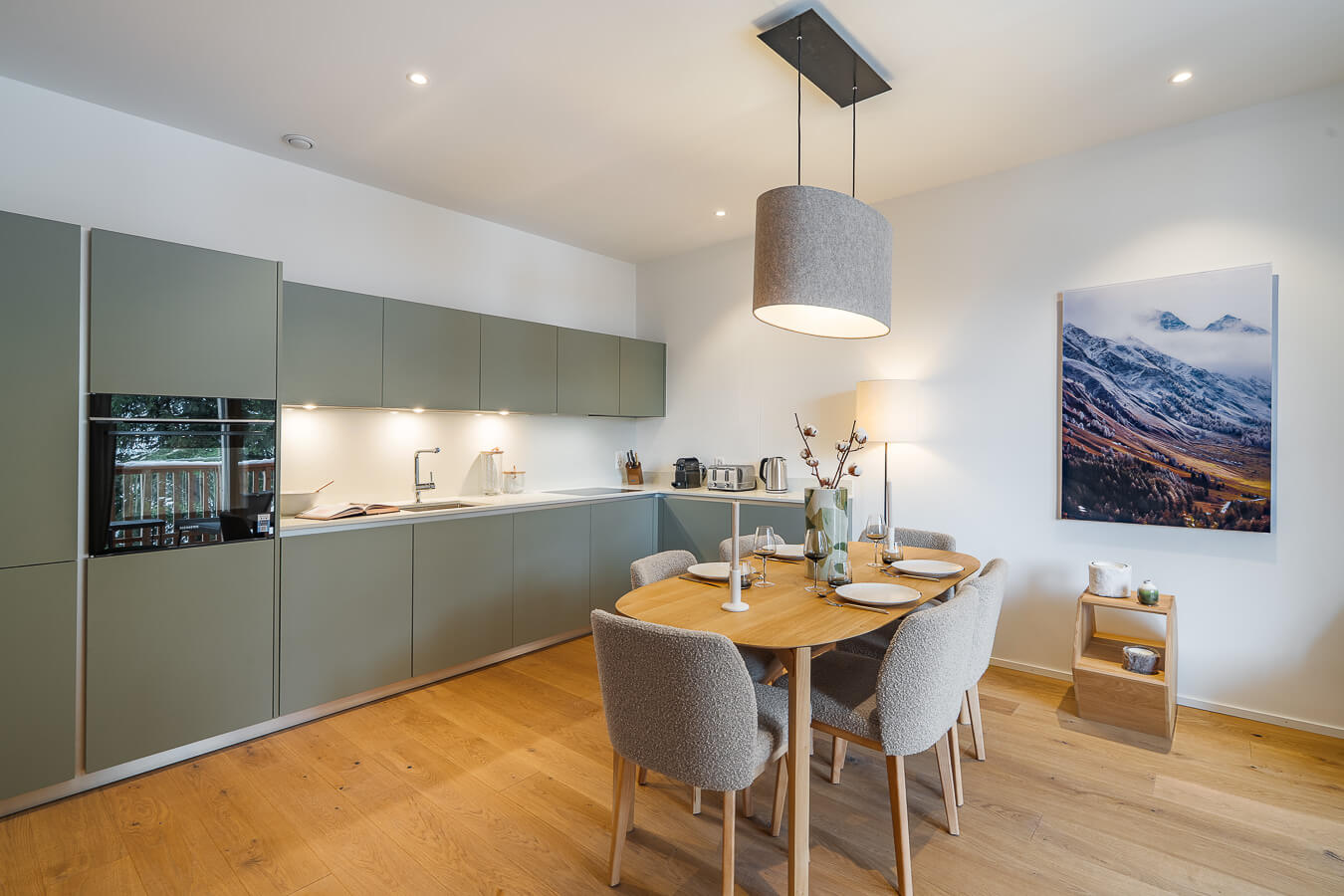 Diese Wohnung verfügt über ein Schlafzimmer mit Doppelbett (180 × 200 cm), ein fensterloses Schlafzimmer mit zwei Einzelbetten (90 × 200 cm) sowie über zwei Badezimmer. Der Wohnbereich bietet eine Sitzecke mit Fernseher und eine voll ausgestattete offene Küche. Möblierte Balkone ergänzen den Wohnraum. Zur Ausstattung der Wohnung gehören Haushaltsgeräte wie Waschmaschine und Trockner, Geschirrspüler, Nespresso-Kaffeemaschine, notwendige Küchenutensilien usw.