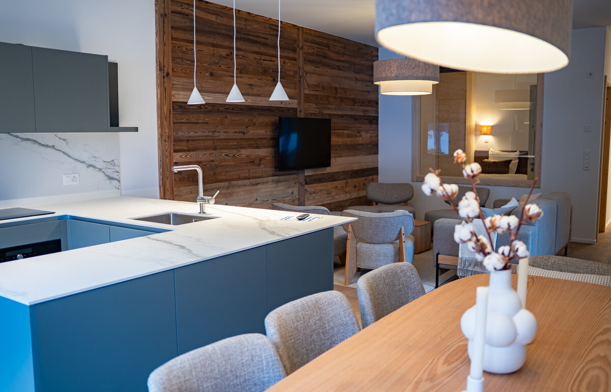 Diese Wohnung verfügt über zwei Schlafzimmer mit Doppelbett (180 × 200 cm), ein Schlafzimmer mit zwei Einzelbetten (90 × 200 cm) sowie über zwei Badezimmer. Der Wohnbereich bietet eine Sitzecke mit Fernseher und eine voll ausgestattete offene Küche. Eine möblierte Terrasse ergänzt den Wohnraum. Zur Ausstattung der Wohnung gehören Haushaltsgeräte wie Waschmaschine und Trockner, Geschirrspüler, Nespresso-Kaffeemaschine, notwendige Küchenutensilien usw.