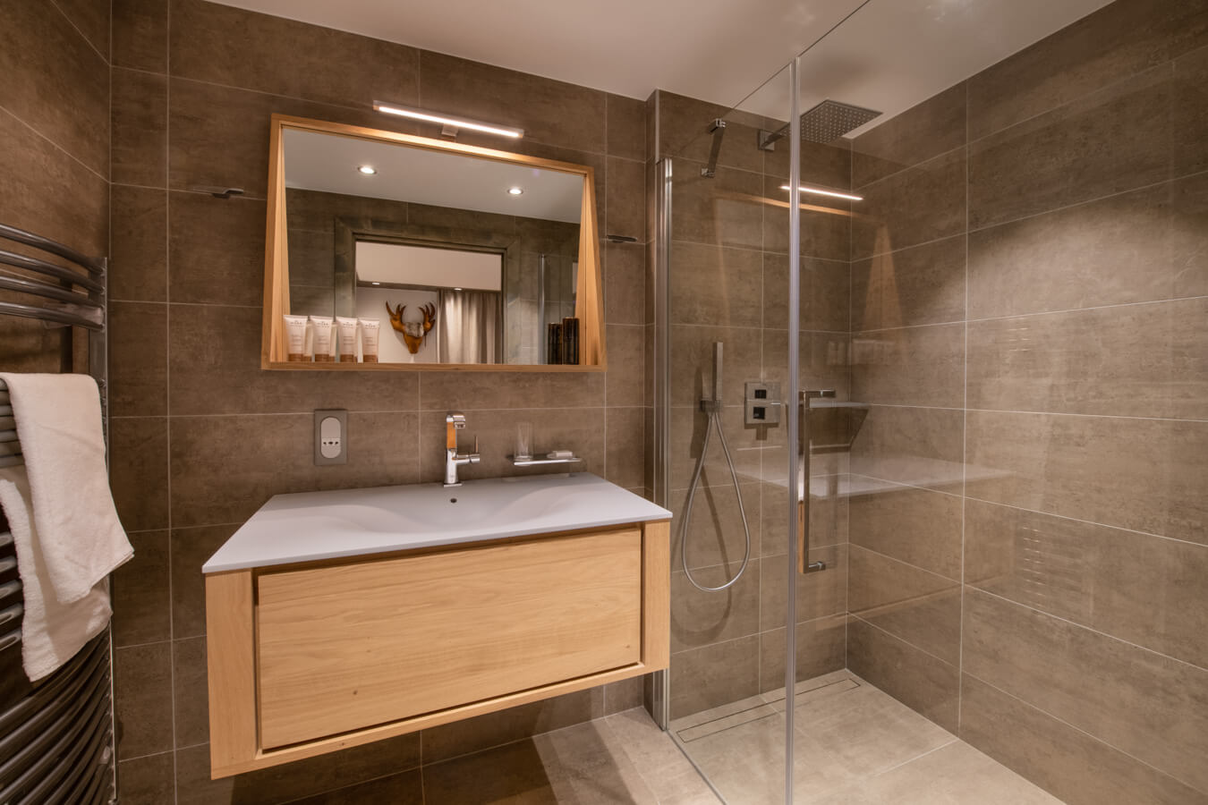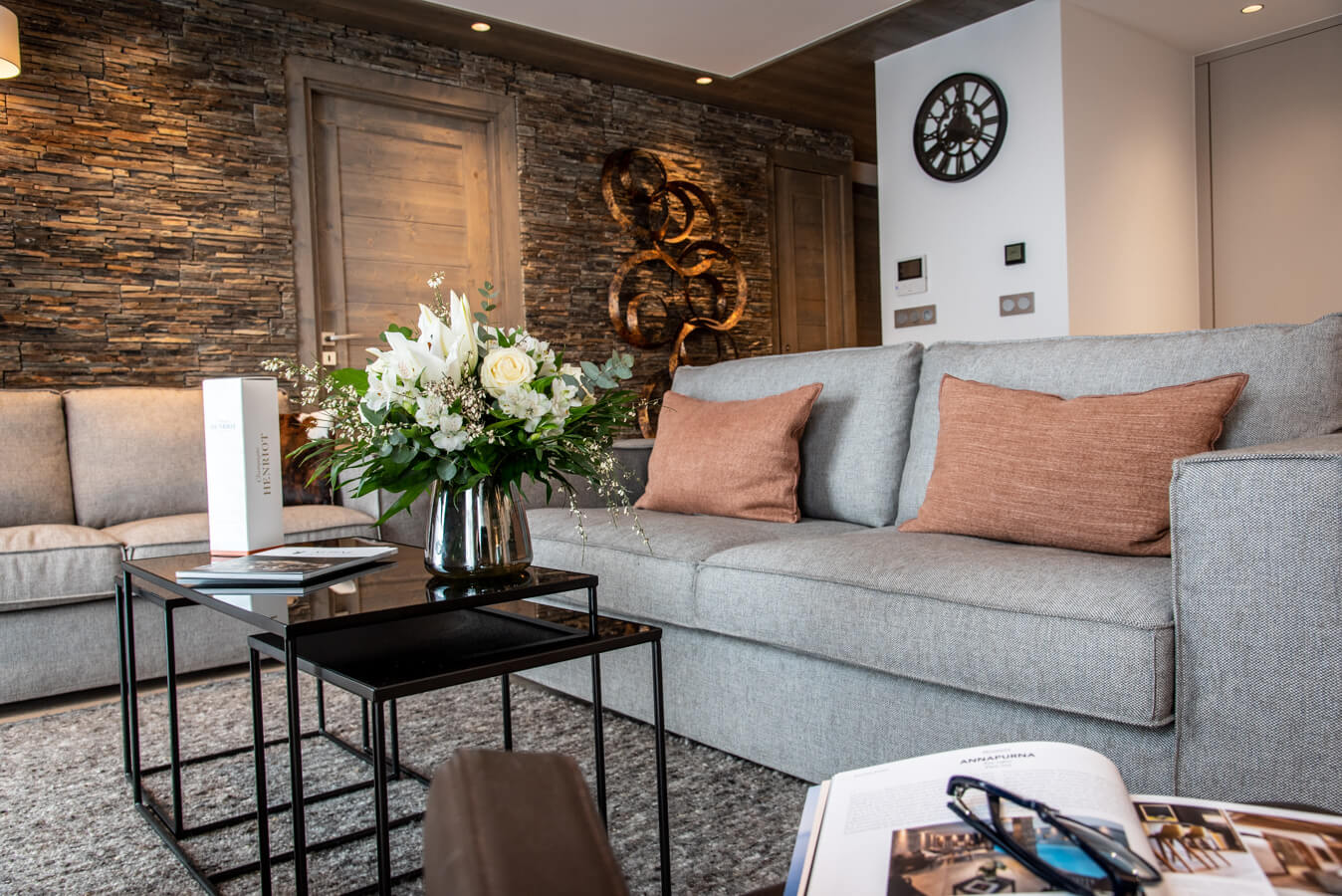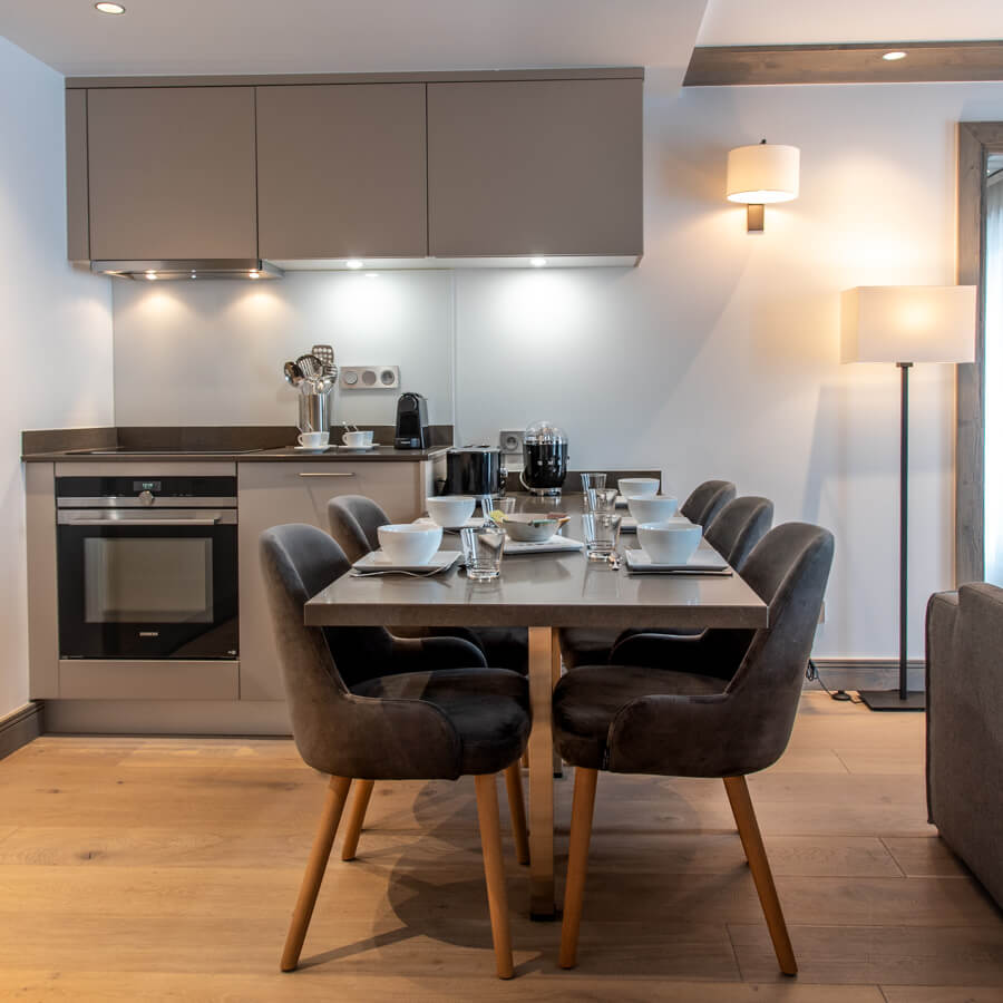 Diese Wohnung verfügt über vier Schlafzimmer mit Doppelbett (180 × 200 cm) sowie über drei Badezimmer, eines davon mit Badewanne. Der Wohnbereich bietet eine Sitzecke mit Fernseher und eine voll ausgestattete offene Küche. Ein Balkon ergänzt den Wohnraum. Zur Ausstattung der Wohnung gehören Haushaltsgeräte wie Waschmaschine, Geschirrspüler, Nespresso-Kaffeemaschine, notwendige Küchenutensilien usw.