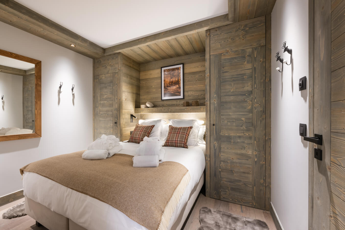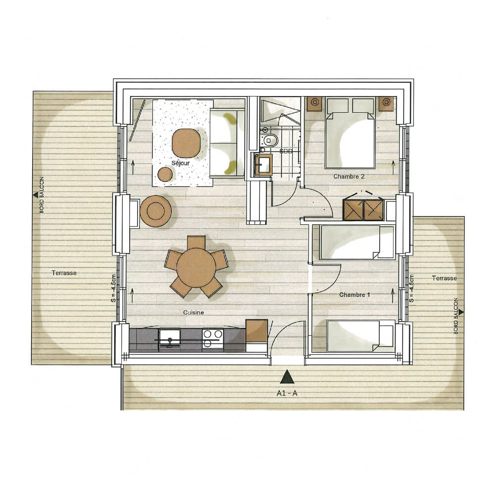 Diese Chalet-Wohnung verfügt über ein Schlafzimmer mit Doppelbett (160 × 200 cm), ein Schlafzimmer mit Einzelbett (90 × 200 cm) und Etagenbett (90 × 200 cm) sowie über ein Badezimmer mit Dusche. Der Wohnbereich bietet eine Sitzecke mit Fernseher, eine voll ausgestattete Küche und zwei Terrassen, darunter eine nach Süden ausgerichtete Terrasse mit freiem Blick auf den Berg Sorebois. Das Chalet ist nach Süden und Norden ausgerichtet. Zur Ausstattung gehören Haushaltsgeräte wie Waschmaschine, Geschirrspüler, Nespresso-Kaffeemaschine, notwendige Küchenutensilien usw.